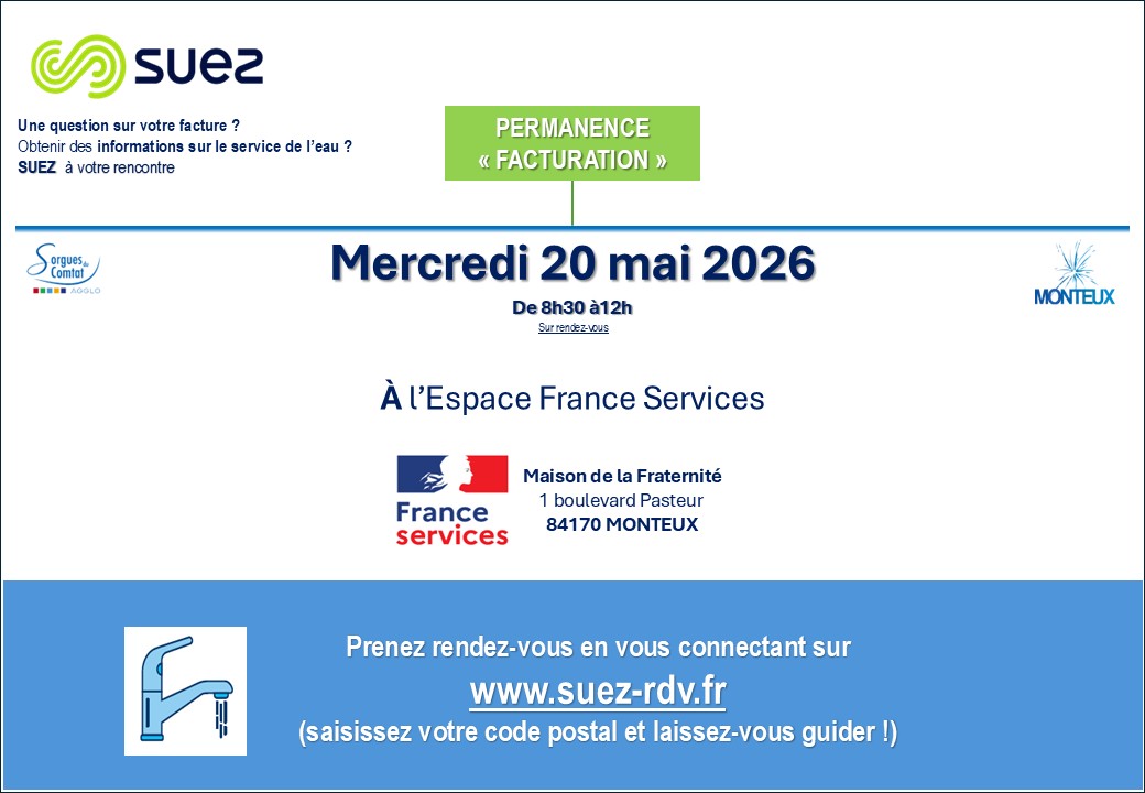 Le mercredi 20 mai, un agent SUEZ sera présent à l’Espace France Service de Monteux pour une permanence, de 8h30 à 12h.